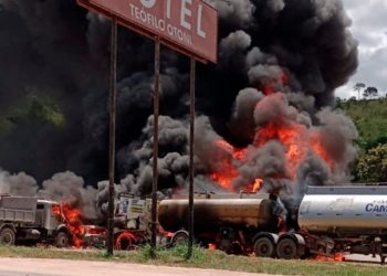 Uma carreta que transportava combustível pegou fogo neste sábado (18), em um posto de gasolina, às margens da BR-116, próximo ...