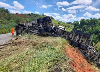 Uma carreta carregada com 36 toneladas de cal virgem tombou, na manhã desta quinta-feira (23), na BR-259, no trecho entre ...