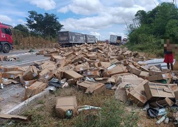 Uma carreta carregada com bananas de dinamite tombou na rodovia BR-116, em Itaobim, no Vale do Jequitinhonha, na manhã desta ...