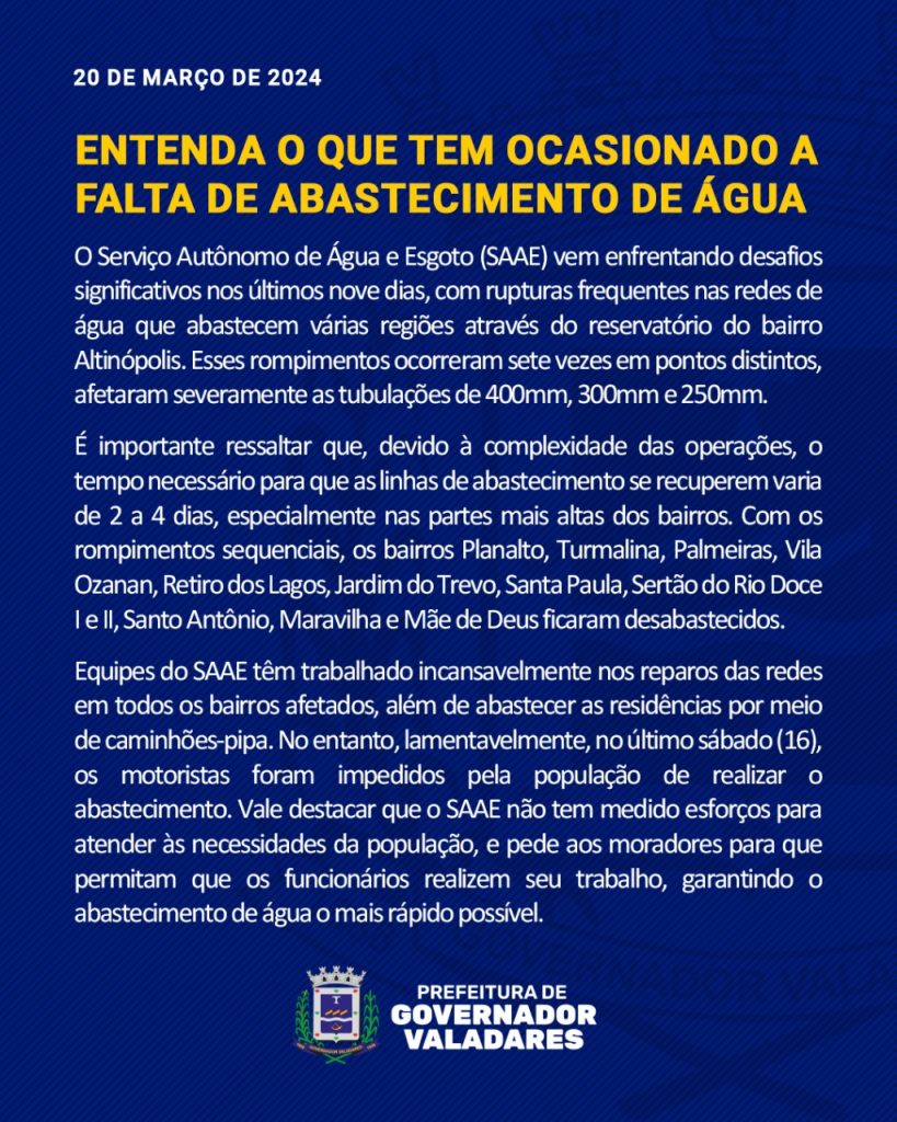 “O Serviço Autônomo de Água e Esgoto (SAAE) vem enfrentando desafios significativos nos últimos nove dias, com rupturas frequentes nas redes de água que abastecem várias regiões através do reservatório do bairro Altinópolis. Esses rompimentos ocorreram sete vezes em pontos distintos, afetaram severamente as tubulações de 400mm, 300mm e 250mm”, disse a nota.