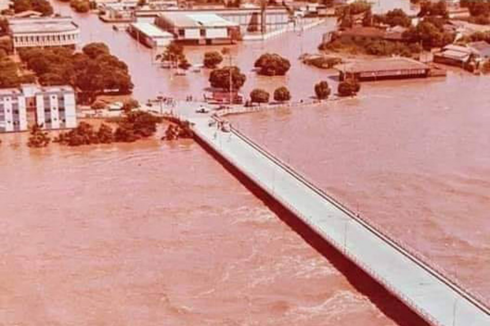 Foto de Valadares na década de 1950. Ao fundo é possível ver a Ilha dos Araújos começando a ser habitada. Já havia a ponte, construída de 1953 a 1955. Antes a travessia era feita por balsas. Já na foto à direita, imagens do bairro na maior cheia já registrada do Rio Doce, em 1979.