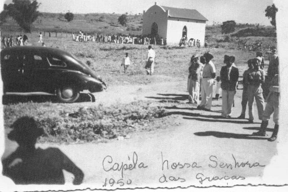 Foto de 1950 mostrando a Capela de Nossa Senhora das Graças, na Avenida Minas Gerais, que, na época, nem era calçada. Ao fundo percebe-se que o bairro ainda não era ocupado e ainda não havia ruas. Hoje, uma linda igreja foi construída no local, que conta com supermercados, farmácias e muito comércio na proximidade. A imagem, cujo crédito é desconhecido, foi postada no site www.familialana.com/gv/. Já na foto à direita uma imagem rara do cruzamento da Rua São Paulo com Sete de Setembro, em 1954. A foto foi tirada do local onde fica atualmente a sede do Corpo de Bombeiros.