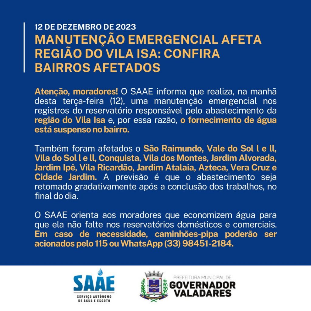 GOVERNADOR VALADARES – O Serviço Autônomo de Água e Esgoto (SAAE) de Valadares suspendeu o abastecimento de água em 15 bairros da cidade nesta terça-feira (12). A medida foi tomada para realizar uma manutenção emergencial nos registros do reservatório responsável pelo abastecimento da região do Vila Isa.