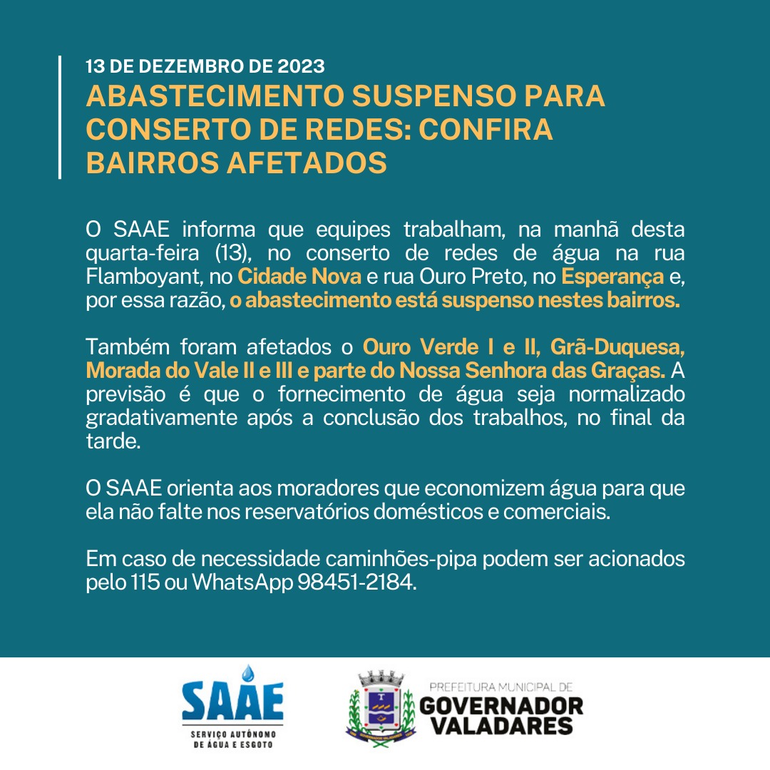 GOVERNADOR VALADARES – O Serviço Autônomo de Água e Esgoto (SAAE) informou que o abastecimento de água está suspenso em oito bairros da cidade nesta quarta-feira (13). A medida ocorre para a realização de obras de conserto de redes nos bairros Cidade Nova e Esperança.