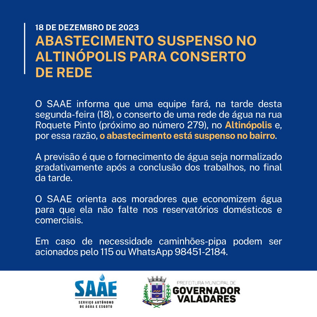 GOVERNADOR VALADARES – O Serviço Autônomo de Água e Esgoto (SAAE) de Valadares informa que o abastecimento de água está suspenso no bairro Altinópolis nesta segunda-feira (18). A medida é para realização de um conserto de rede na rua Roquete Pinto.