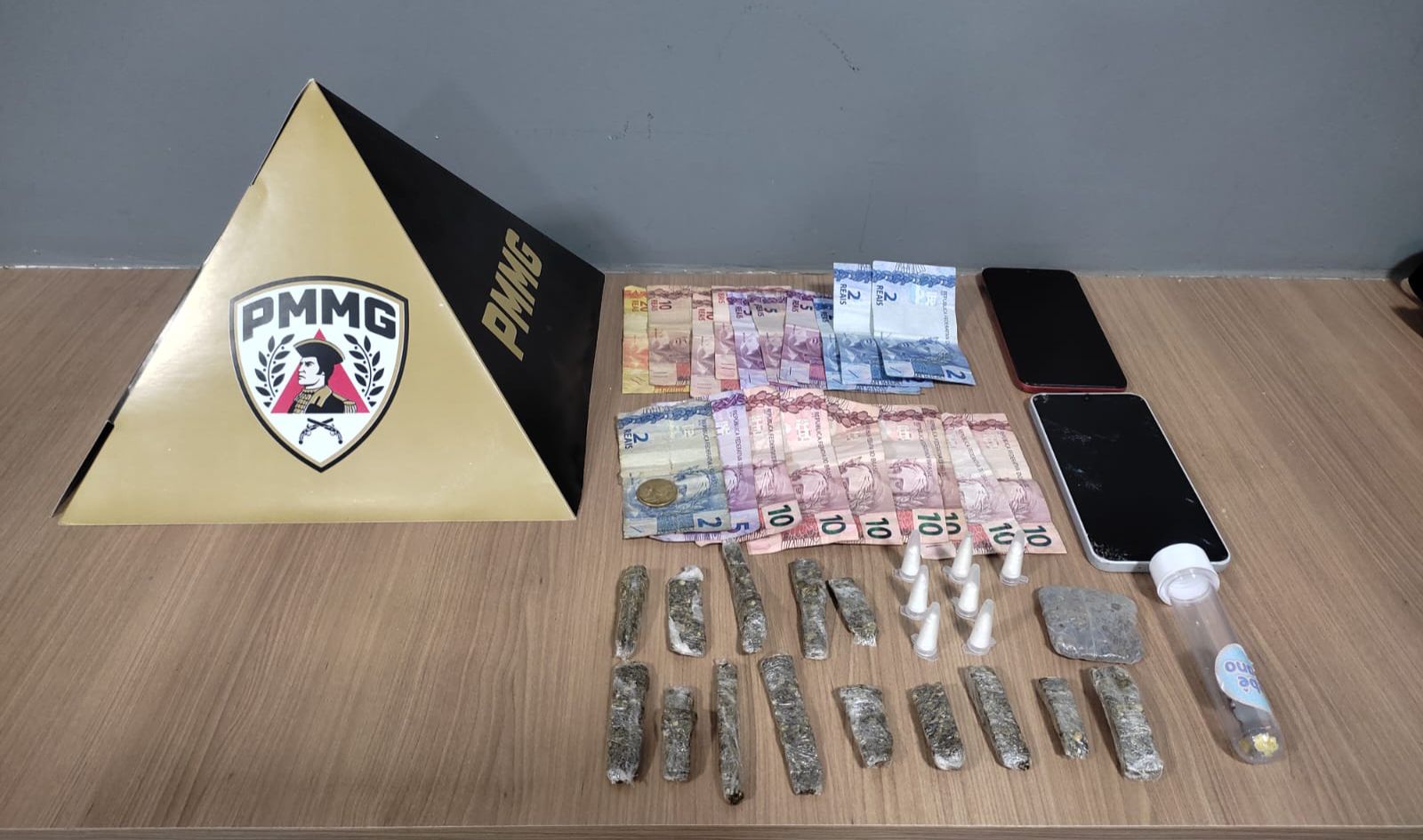 Durante as buscas, foram localizadas 14 buchas e um tablete de maconha, uma pedra de crack, sete eppendorfs de cocaína, dois aparelhos celulares e R$ 150,25 em dinheiro.