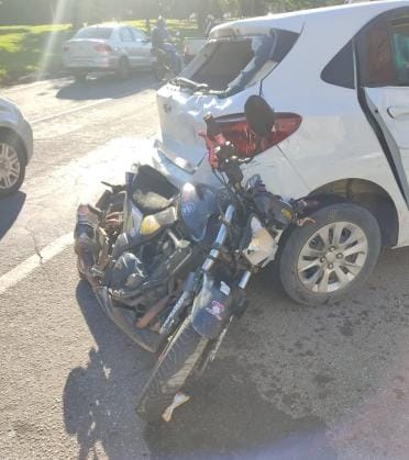 Neste momento, uma motociclista, de 25 anos, em uma Honda CG 150, que seguia no sentido contrário, bateu na traseira do Onix. Com o impacto, a motociclista e sua passageira, uma adolescente de 14 anos, caíram da moto e sofreram lesões leves.