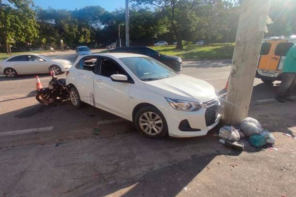 Neste momento, uma motociclista, de 25 anos, em uma Honda CG 150, que seguia no sentido contrário, bateu na traseira do Onix. Com o impacto, a motociclista e sua passageira, uma adolescente de 14 anos, caíram da moto e sofreram lesões leves.