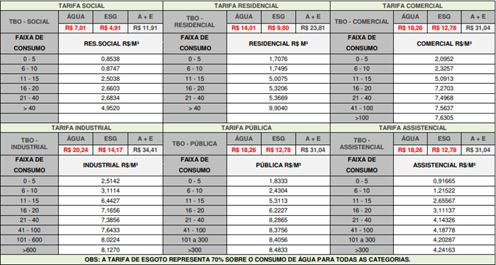 As tarifas praticadas pela concessionária Águas de Valadares serão as indicadas na tabela a seguir: