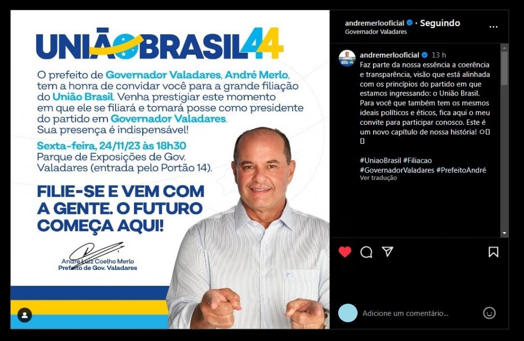“Faz parte da nossa essência a coerência e transparência, visão que está alinhada com os princípios do partido em que estamos ingressando: o União Brasil. Para você que também tem os mesmos ideais políticos e éticos, fica aqui o meu convite para participar conosco. Este é um novo capítulo de nossa história”, publicou André Merlo em um de seus perfis.