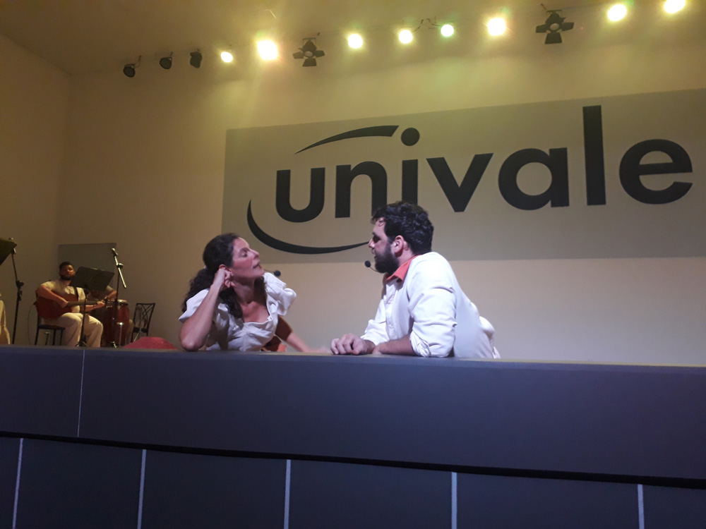 Plateia emocionada, aplaudindo de pé. Assim terminou o espetáculo “Nosso chão”, do Teatro Universitário da UNIVALE, que encantou aproximadamente 600 pessoas na noite de quarta-feira (4), no Centro Cultural Hermírio Gomes da Silva, campus II. No sábado (31 de agosto), a peça já tinha sido apresentada com casa cheia também no Teatro Atiaia, para um público de cerca de 300 pessoas. A equipe do Teatro Universitário encenará a peça novamente no dia 28 deste mês, em Mariana, no Festival de Teatro Comunitário realizado no município. Antes disso, nos dias 20 e 21, alguns trechos do espetáculo serão apresentados novamente na UNIVALE, durante o 22º Simpósio de Pesquisa e Iniciação Científica da instituição.