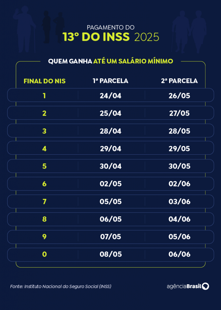 BRASÍLIA – Cerca de 34,2 milhões de aposentados, pensionistas e beneficiários de auxílios do Instituto Nacional do Seguro Social (INSS) começam a receber nesta quinta-feira (24) a primeira parcela do décimo terceiro salário. Feito de forma escalonada, conforme o dígito final do Número de Inscrição Social (NIS), o pagamento vai até 8 de maio.