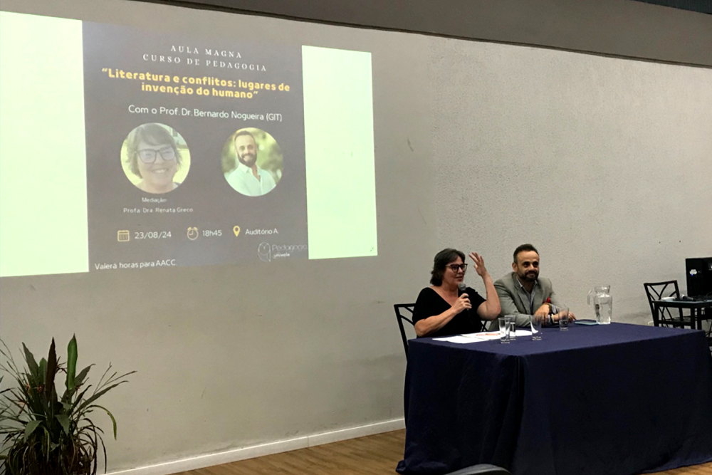 O curso de Pedagogia da UNIVALE teve sua aula magna na noite de sexta-feira (23). Realizada em parceria com o mestrado em Gestão Integrada do Território (GIT), a aula com o tema “Literatura e conflitos: lugares de invenção do humano” foi ministrada pelo professor Bernardo Nogueira (do GIT e do curso de Direito) e mediada pela professora Renata Greco.
