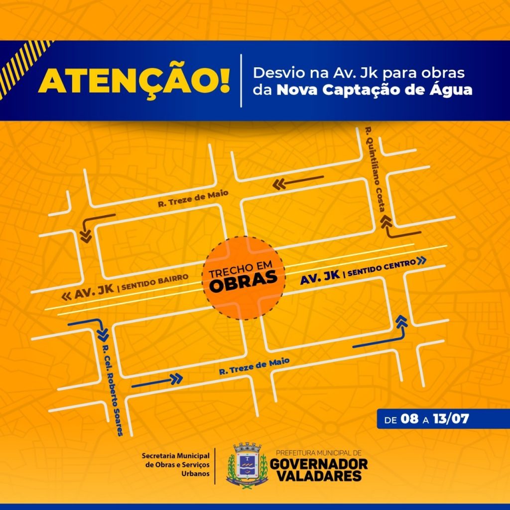 Atenção, motoristas! A partir desta quinta-feira (8) a obra da adutora que vai fornecer a Governador Valadares uma nova captação de água a partir do rio Corrente Grande vai passar pelo cruzamento da avenida JK com a rua Lincoln Byrro, entre os bairros Vila Bretas e São Paulo. De acordo coma Fundação Renova, a previsão é de que o cruzamento seja liberado até terça-feira (13).