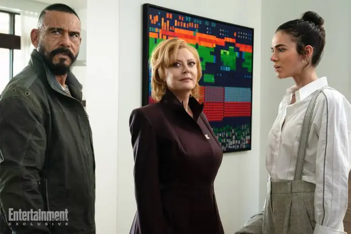 Bruna Marquezine surgiu como Jenny Kord em uma nova imagem de Besouro Azul liberada nesta quinta-feira (27) pela EW. A atriz brasileira surgiu ao lado de Raoul Max Trujillo (Conrad Carapax) e Susan Sarandon (Victoria Kord).