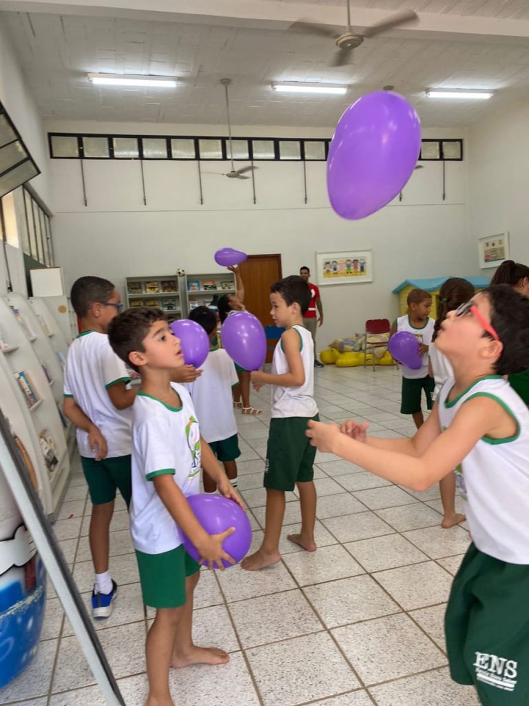 A visita de instituições de educação infantil e ensino fundamental faz parte das atividades realizadas pela Brinquedoteca, e cada atendimento é planejado de acordo com a demanda da turma – no caso das crianças da Escola Novo Saber era o brincar, os territórios e suas dimensões.