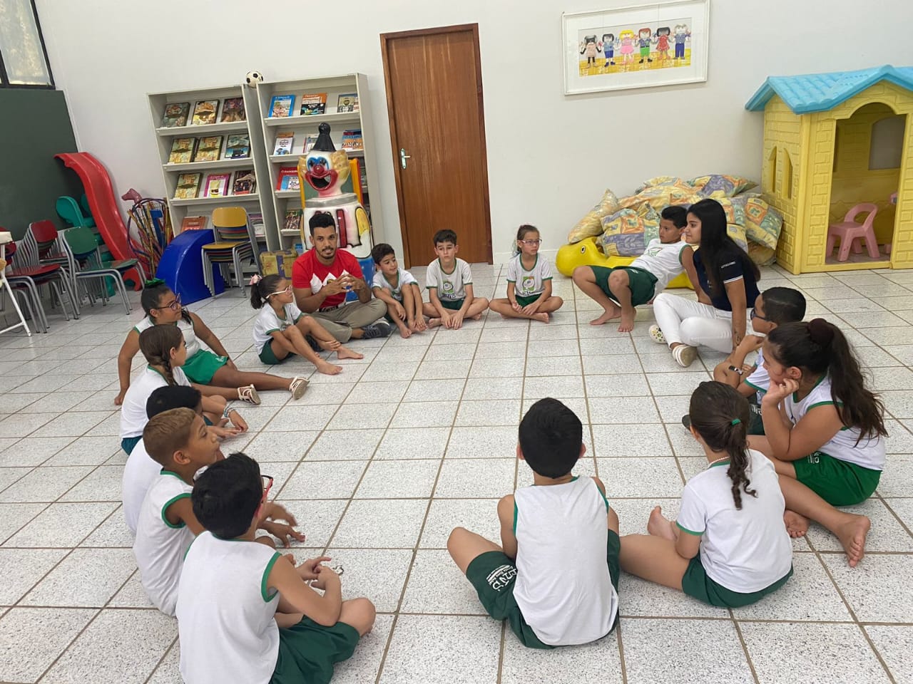 A visita de instituições de educação infantil e ensino fundamental faz parte das atividades realizadas pela Brinquedoteca, e cada atendimento é planejado de acordo com a demanda da turma – no caso das crianças da Escola Novo Saber era o brincar, os territórios e suas dimensões.