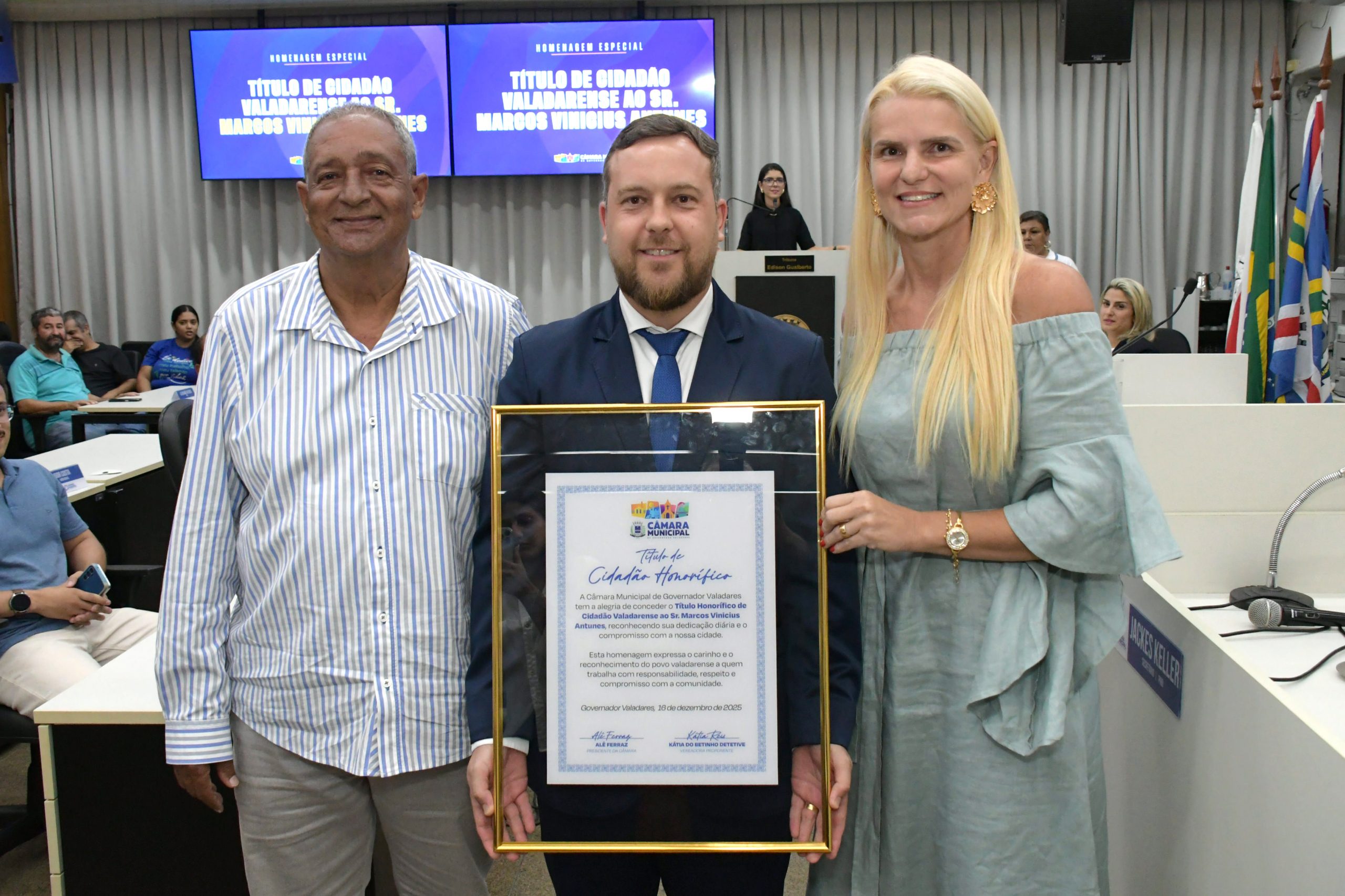 GOVERNADOR VALADARES – A Câmara Municipal de Governador Valadares realizou, na noite desta terça-feira (16), uma reunião solene para a entrega do título de cidadão valadarense ao engenheiro e diretor-executivo da Águas de Valadares, Marcos Vinícius Antunes. A homenagem, proposta pela vice-presidente da Casa, vereadora Kátia do Betinho Detetive, reconhece a contribuição técnica e profissional do homenageado para o desenvolvimento do saneamento básico no município.