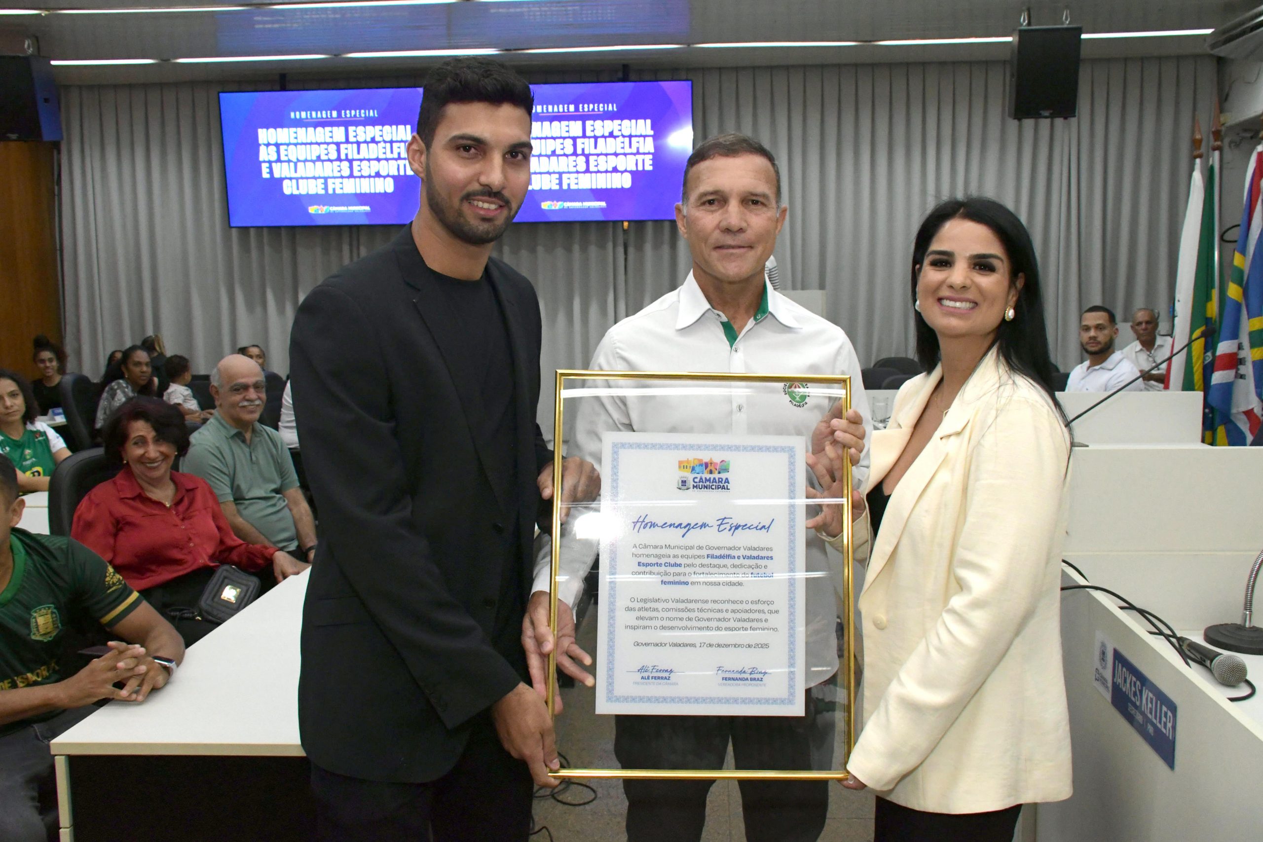 GOVERNADOR VALADARES – As equipes Filadélfia Futebol Clube e Valadares Esporte Clube Feminino foram homenageadas durante Reunião Especial realizada na Câmara Municipal de Governador Valadares, na noite desta quarta-feira (17). A iniciativa partiu da vereadora Fernanda Braz (DC) e reconheceu conquistas esportivas expressivas alcançadas ao longo de 2025, que projetaram o município nos cenários nacional e internacional do futebol feminino.