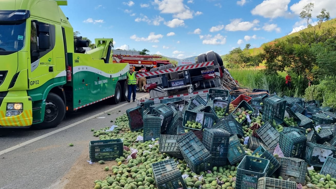 ENGENHEIRO CALDAS – Um acidente foi registrado na manhã desta segunda-feira (8) na BR-116, próximo à cidade de Engenheiro Caldas. Um caminhão carregado com mangas tombou em uma curva. O motorista ficou preso às ferragens.