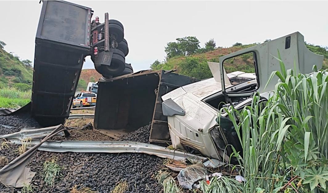 De acordo com a PMRv, o motorista seguia no sentido Governador Valadares quando, ao se aproximar de um trecho de descida seguido de curva, percebeu que o veículo começou a sair da pista. O condutor ainda tentou retomar o controle da direção, mas não conseguiu, e o caminhão acabou tombando fora da rodovia.