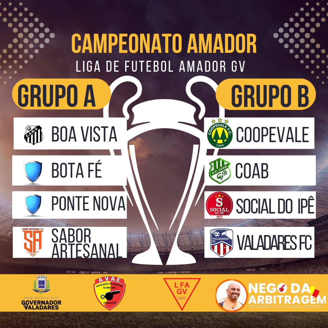 Para esta edição, as oito equipes participantes foram divididas em dois grupos: A e B. O primeiro é composto pelo Boa Vista, Bota Fé, Ponte Nova e Sabor Artesanal. Seguindo para o grupo B, temos o tradicional time do Coopevale, o COAB, o Social do Ipê e, por último, o Valadares Futebol Clube.