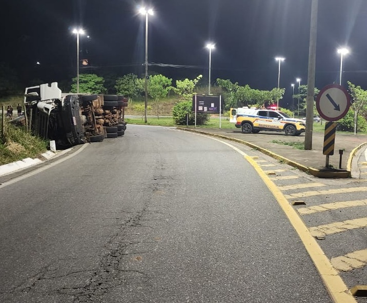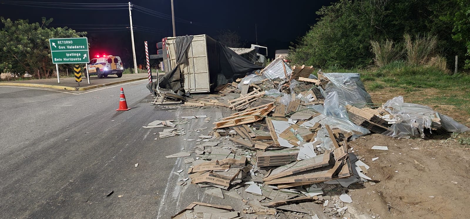 GOVERNADOR VALADARES – Uma carreta carregada com cerâmica tombou, na noite dessa quarta-feira (22), na rotatória da Pomal, na BR-259, no bairro Morada do Vale III, em Valadares.