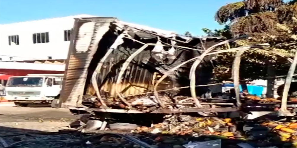 Aliás o fogo também atingiu a fachada de uma farmácia e de uma loja de roupas. Com o apoio de uma retroescavadeira, a carga foi retirada. A carreta ficou parcialmente destruída, e o fogo atingiu todo carregamento de mamão. Ninguém ficou ferido.