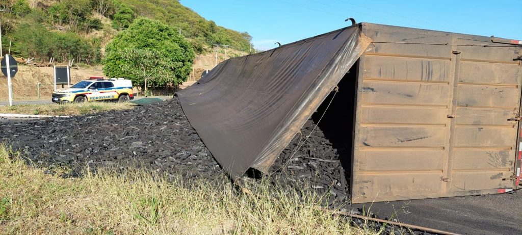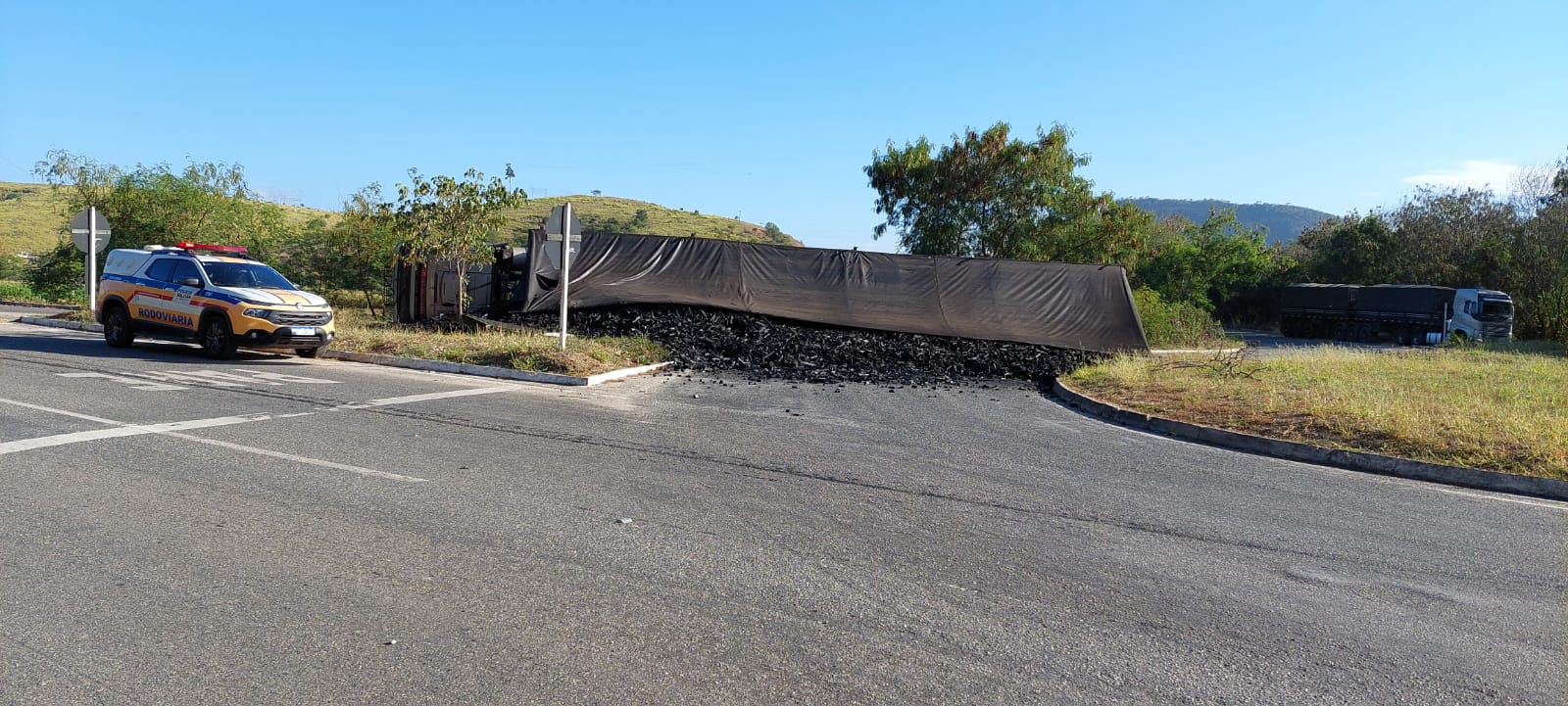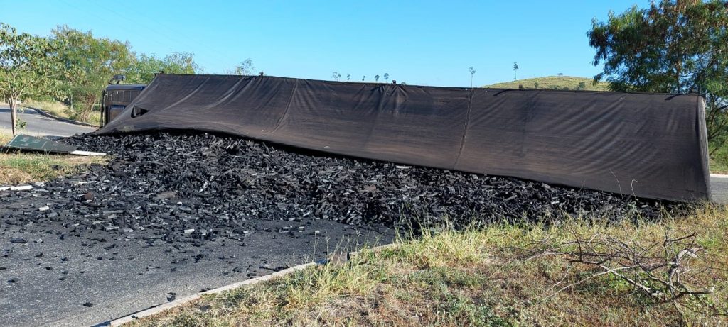 Uma carreta carregada de carvão tombou, nesta quarta-feira (29), no Km 06 da BR-259, na rotatória de entrada para Aimorés (MG). O motorista não se feriu.