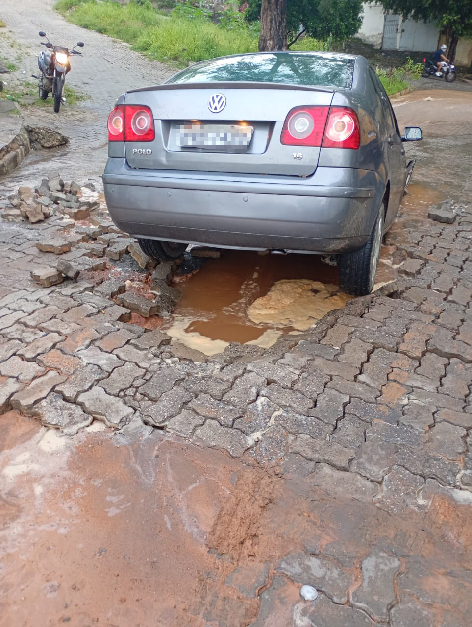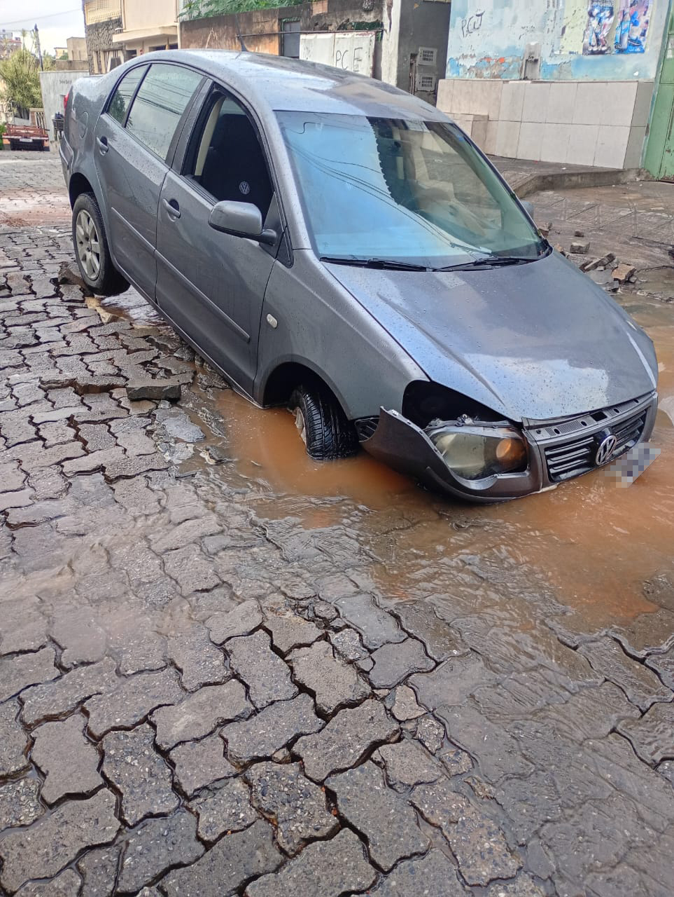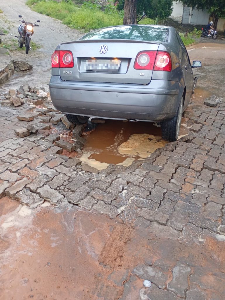 GOVERNADOR VALADARES – Um veículo VW Polo caiu em uma cratera aberta na Rua Monte Azul, no bairro Santa Helena/Esperança, em Governador Valadares, nesta quarta-feira.