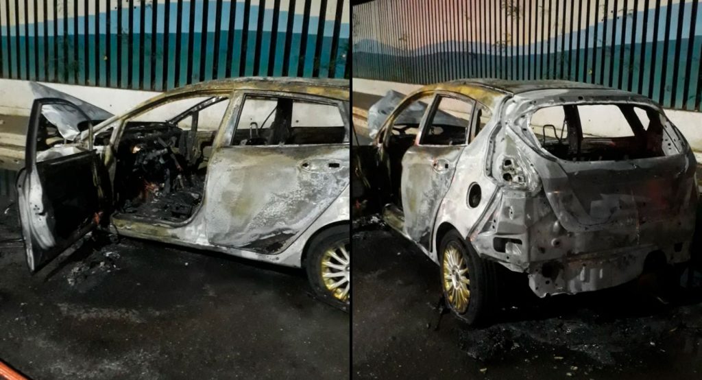 Um carro pegou fogo, na noite dessa terça-feira (4), na avenida Moacir Paleta, no bairro São Pedro, em Valadares. Uma jovem, de 19 anos, que conduzia o veículo. O carro ficou completamente queimado.