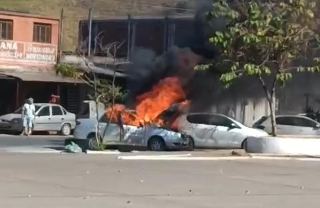 Carro pega fogo no Centro de Coronel Fabriciano e chamas atingem outro veículo