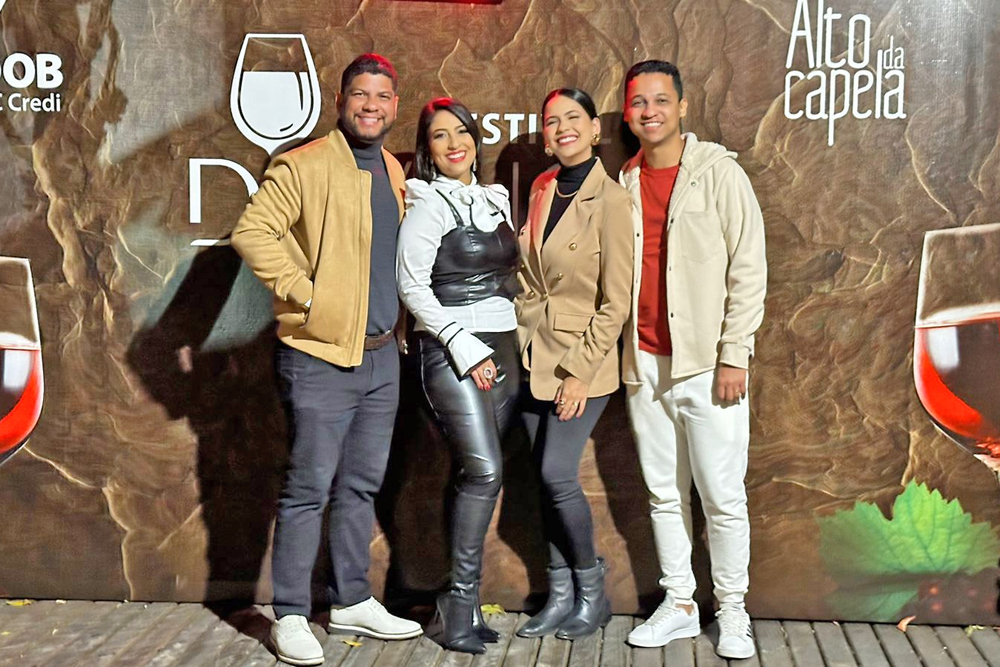 O empresário Daniel Mendes e a linda esposa Carol Queiroz, ambos da Ravena Multimarcas, acompanhados dos amigos Bruno Braga, do Banco do Brasil, e a esposa Tays Braga. O clique foi feito durante o Festival Di Vino Ibituruna, que aconteceu no último final de semana, em Valadares.