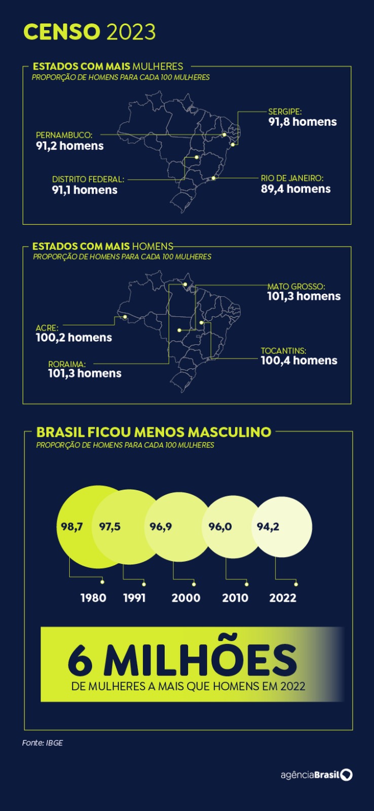O principal indicador usado pelo IBGE nessa categoria censitária é chamado “razão de sexo”, que leva em consideração o número de homens em relação ao de mulheres. Se o número for menor do que 100, há mais mulheres. Se for maior do que 100, há mais homens. Se em 1980, havia 98,7 homens para cada 100 mulheres, em 2022 essa proporção passou a ser de 94,2 homens para cada 100 mulheres.