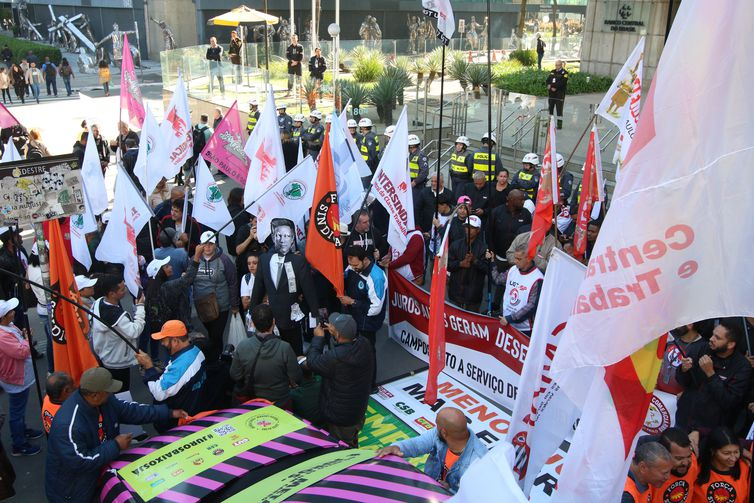 Centrais sindicais promoveram nesta terça-feira (20) um protesto em frente ao prédio do Banco Central (BC), na Avenida Paulista, na região central da capital, pedindo redução na taxa básica de juros. O grupo levou bandeiras e um carro de som, ocupando a calçada em frente ao edifício. Um cordão de policiais militares impediu a aproximação dos manifestantes da entrada do prédio.