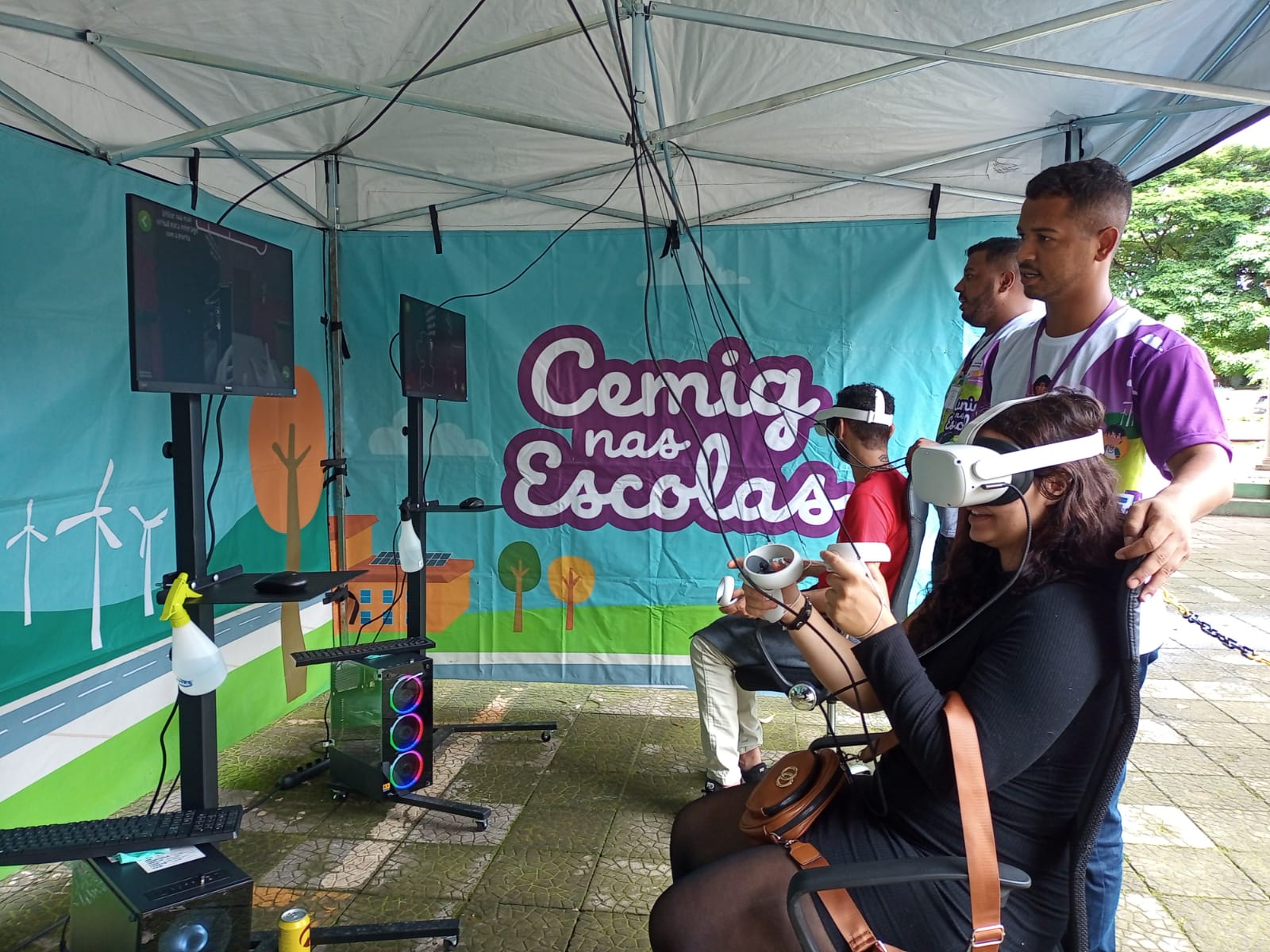 Um dos destaques é o caminhão interativo, que abriga um jogo no estilo escape room. No interior do veículo, os participantes são desafiados a resolver enigmas e situações relacionadas ao consumo de energia elétrica, colocando em prática conceitos aplicáveis ao dia a dia. O espaço é totalmente acessível, garantindo a participação de pessoas com deficiência. Além do caminhão, o circuito dispõe de uma tenda tecnológica, onde são oferecidos diversos jogos educativos, com destaque para a experiência em realidade virtual, que aproxima o público de situações reais e estimula a reflexão sobre o consumo consciente.
