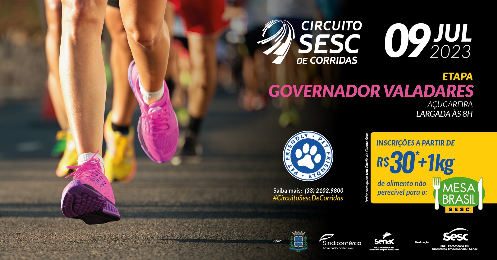 O Circuito Sesc de Corridas, evento que visa incentivar a prática de exercícios físicos e reunir a família dos participantes por meio de ações de lazer, será realizado no dia 9 de julho e já está com inscrições abertas, até o dia 5 de julho, para a edição de Governador Valadares. No evento, além das corridas para diferentes públicos, os visitantes e competidores poderão aproveitar os shows de música e um espaço de relaxamento.