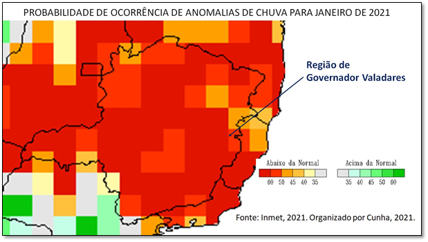 De acordo com Daniela Martins Cunha, professora, climatologista e pesquisadora do Instituto Federal de Minas Gerais em Governador Valadares (IFMG/GV), janeiro é o segundo mês mais chuvoso do ano em Governador Valadares, sendo esperado um volume mensal de 173 mm.