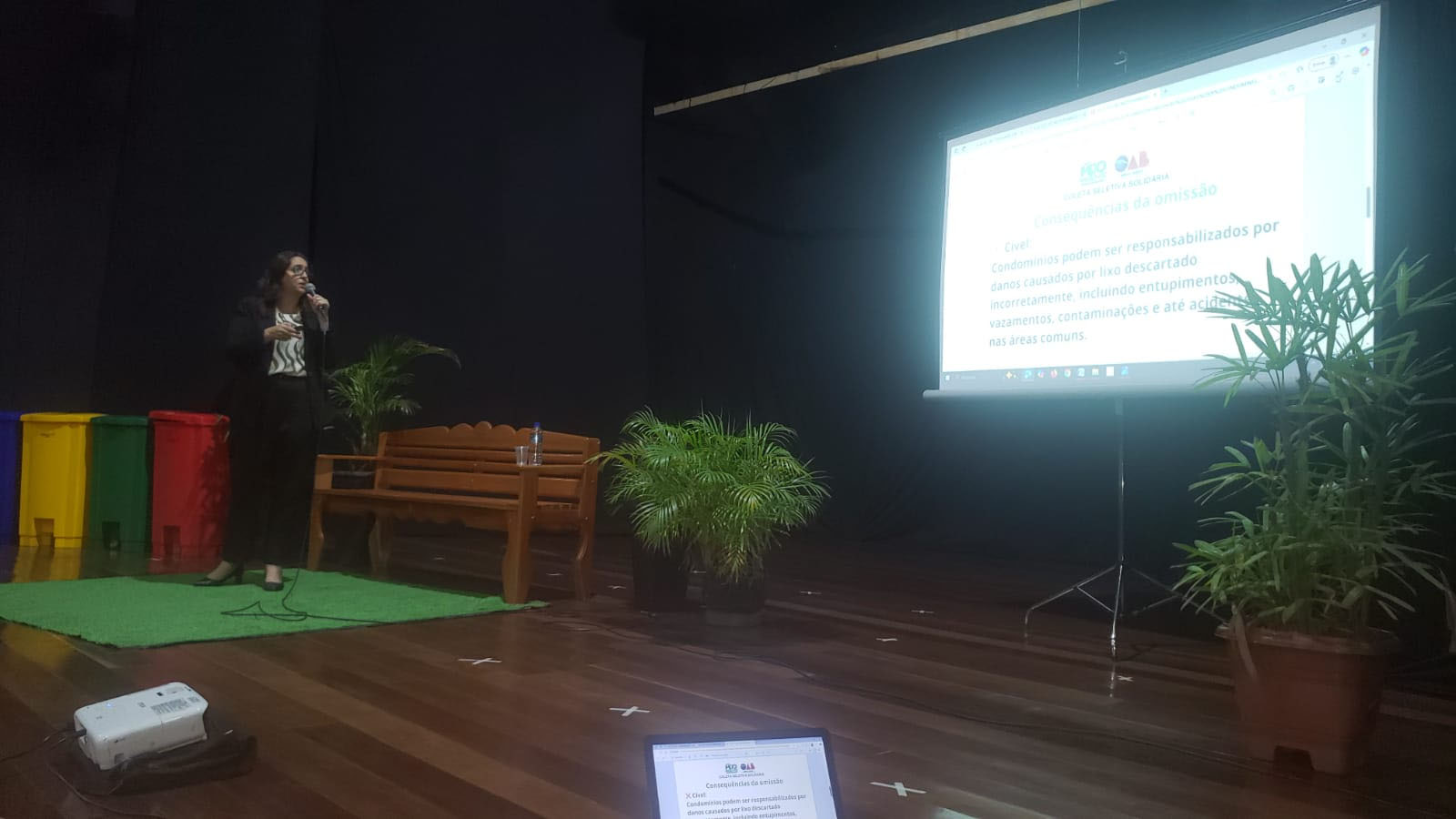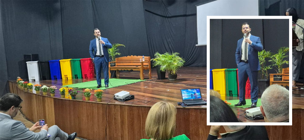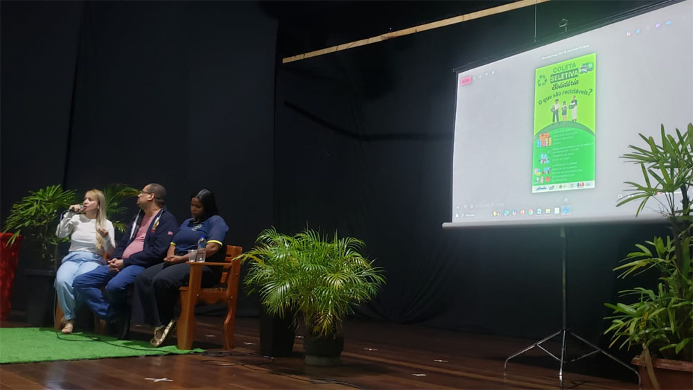 Outro grande diferencial foi o formato. No palco, foi criado um cenário que simulava a área comum de um condomínio, com banco, plantas e lixeiras nas cores que representam a coleta seletiva. Um momento curioso foi quando o Secretário de Meio Ambiente explicava sobre o meio ambiente artificial e surpreendeu o público jogando um copo descartável no chão. Ele perguntou qual das cores representava a coleta de plástico — uma interação direta que mostrou que, em vez de discursos distantes, o evento uniu direito, realidade prática, emoção e soluções acessíveis.