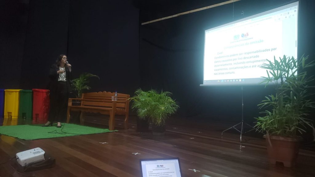 Ela reforçou que, de acordo com a Lei nº 12.305/2010, os condomínios são geradores de resíduos sólidos e, por isso, têm obrigação legal de separar, armazenar e destinar adequadamente o lixo que produzem. Ignorar isso tem consequências reais. Na esfera cível ela citou entupimentos, contaminações, vazamentos e acidentes nas áreas comuns podem gerar indenizações. Na trabalhista exemplificou com funcionários que lidam com lixo sem EPI ou treinamento podem levar o condomínio a ser processado e condenado a pagar adicional de insalubridade (NR-15) e na ambiental, o descarte irregular pode configurar crime ambiental, com base na Lei nº 9.605/1998, sujeito a multa e outras sanções.