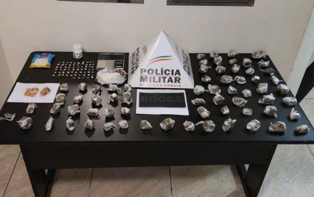 Ao todo, os militares localizaram 66 tabletes de maconha (1,250 kg), uma porção de cocaína (75g), 65 pedras de crack (60g), uma pedra grande de crack, um pote de ácido bórico, material para embalar drogas e uma balança de precisão.