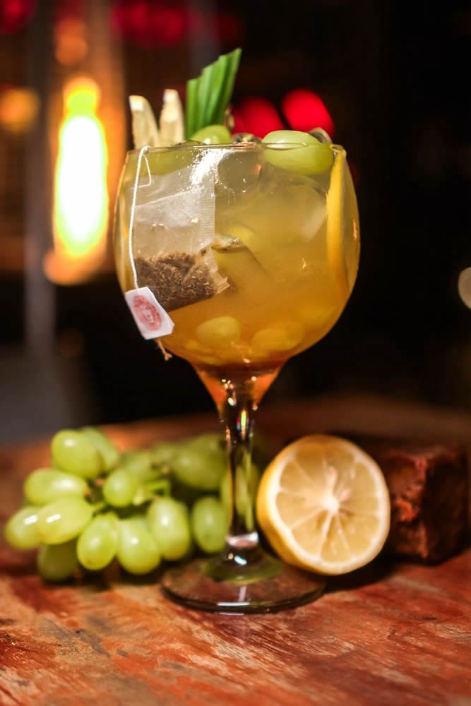 Vodca, suco de uva verde, limão-siciliano, xarope de rapadura, uva fresca e sachê de capim-limão.