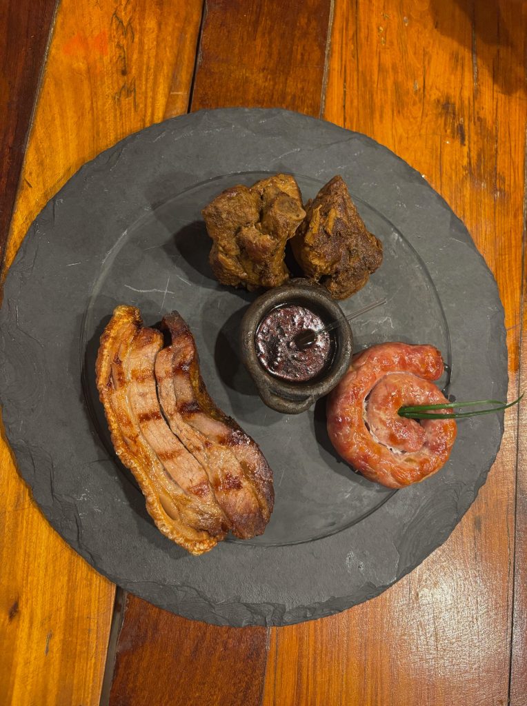 Linguiça artesanal, costelinha suína e torresmo de barriga, servidos com molho de rapadura e capim-limão — crocância, maciez e doçura em perfeita harmonia.