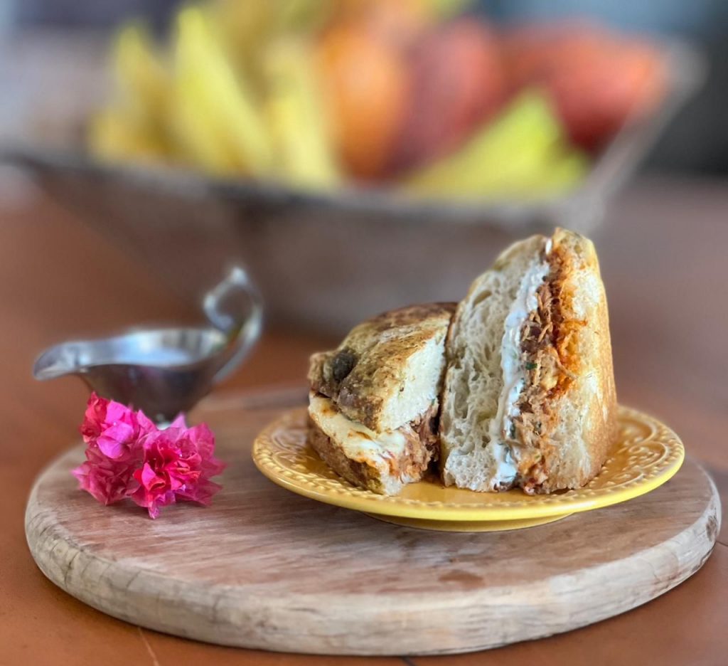 Focaccia de pesto recheada com pernil de porco bem temperado, queijo Sereno meia cura derretido, molho de tomate agridoce e creme de queijo com iogurte e cebolinha. Um encontro de frescor, memória e afeto.