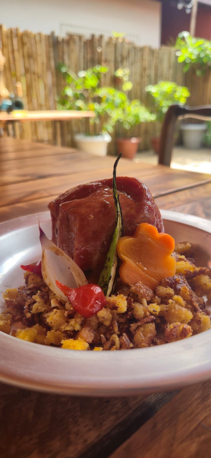 Porco na lata ao molho rôti, farofa de broa de milho e conserva mineira de legumes. Um prato que traduz tradição e memória em forma de sabor.