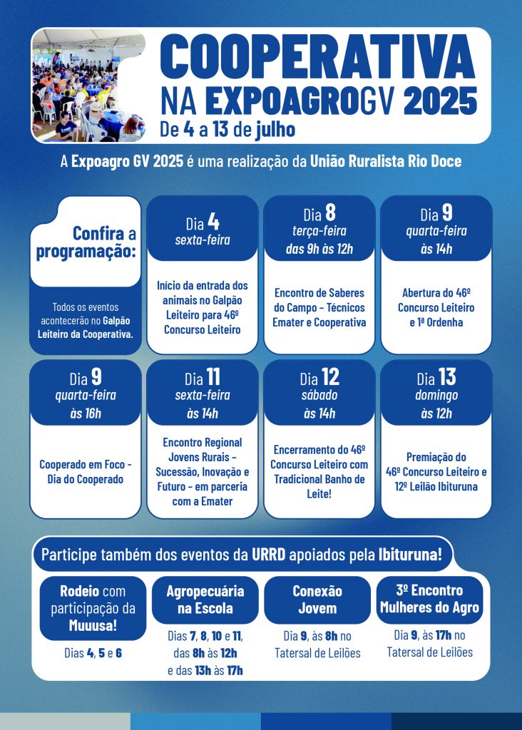 Durante todos os dias da feira, o estande da Cooperativa estará aberto ao público, das 8h às 19h, oferecendo informações, atendimento e ações voltadas tanto para os cooperados quanto para os visitantes. Além disso, a Cooperativa será parceira da União Ruralista Rio Doce (URRD) no apoio a eventos como o Rodeio com participação da Muuusa (4, 5 e 6 de julho), o Projeto Agropecuária na Escola, o Conexão Jovem e o 3º Encontro Mulheres do Agro.