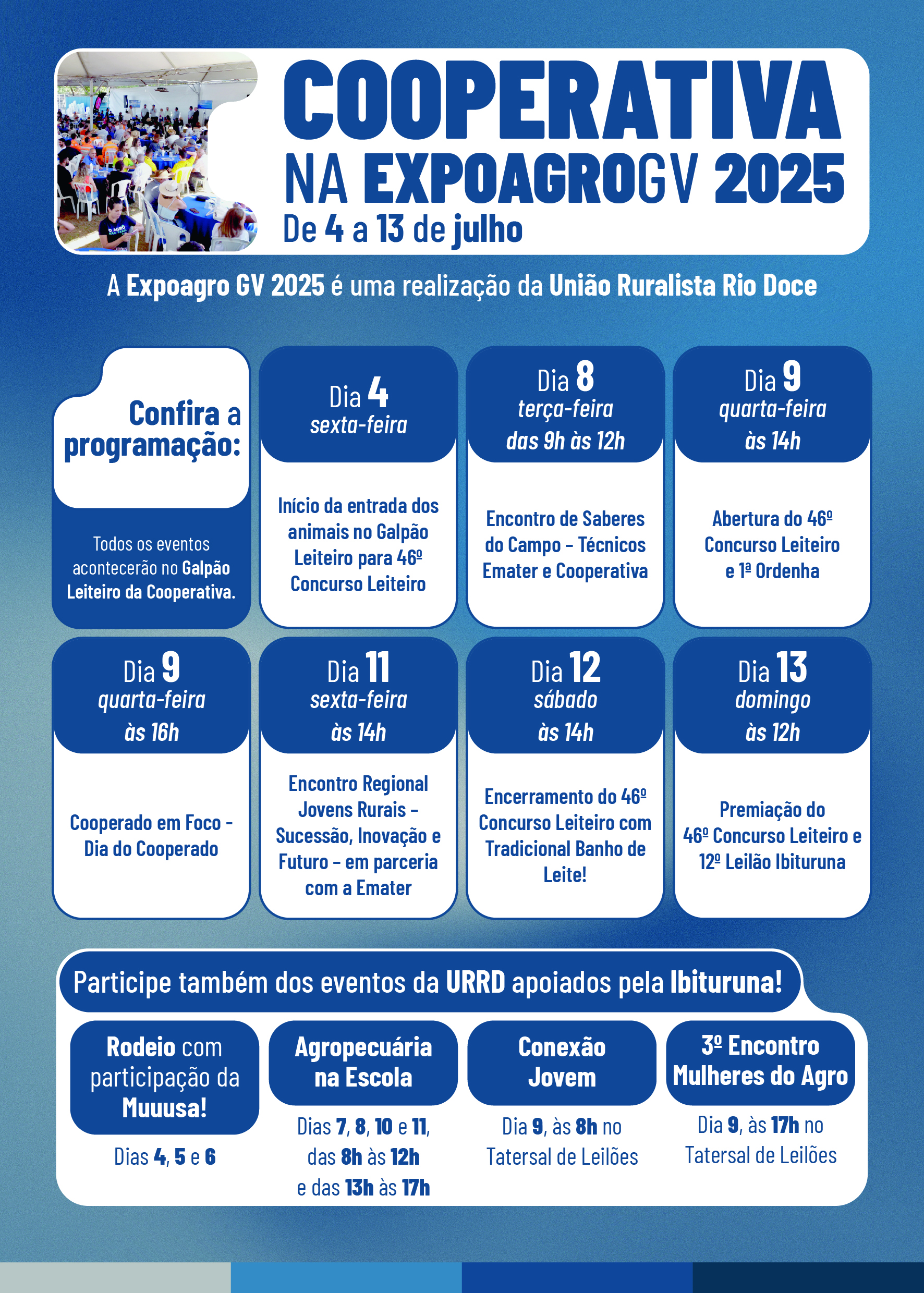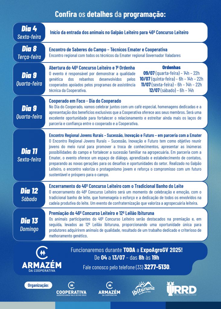 No dia 9, além da abertura do Concurso Leiteiro, a Cooperativa promove o “Cooperado em Foco – Dia do Cooperado”, com uma programação especial voltada aos membros da instituição. O evento contará com café da tarde, homenagens, apresentação de casos de sucesso e exposição dos benefícios oferecidos aos cooperados.