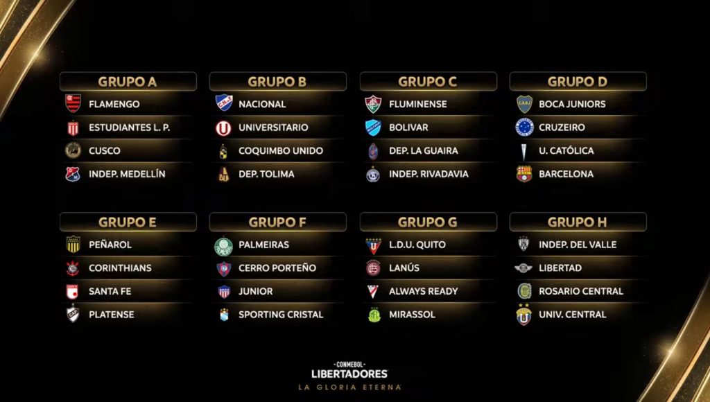 No Grupo D, o Cruzeiro terá pela frente Boca Juniors (Argentina), Universidad Católica (Chile) e Barcelona (Equador). O Corinthians aparece no Grupo E, ao lado de Peñarol (Uruguai), Independiente Santa Fe (Colômbia) e Platense (Argentina).