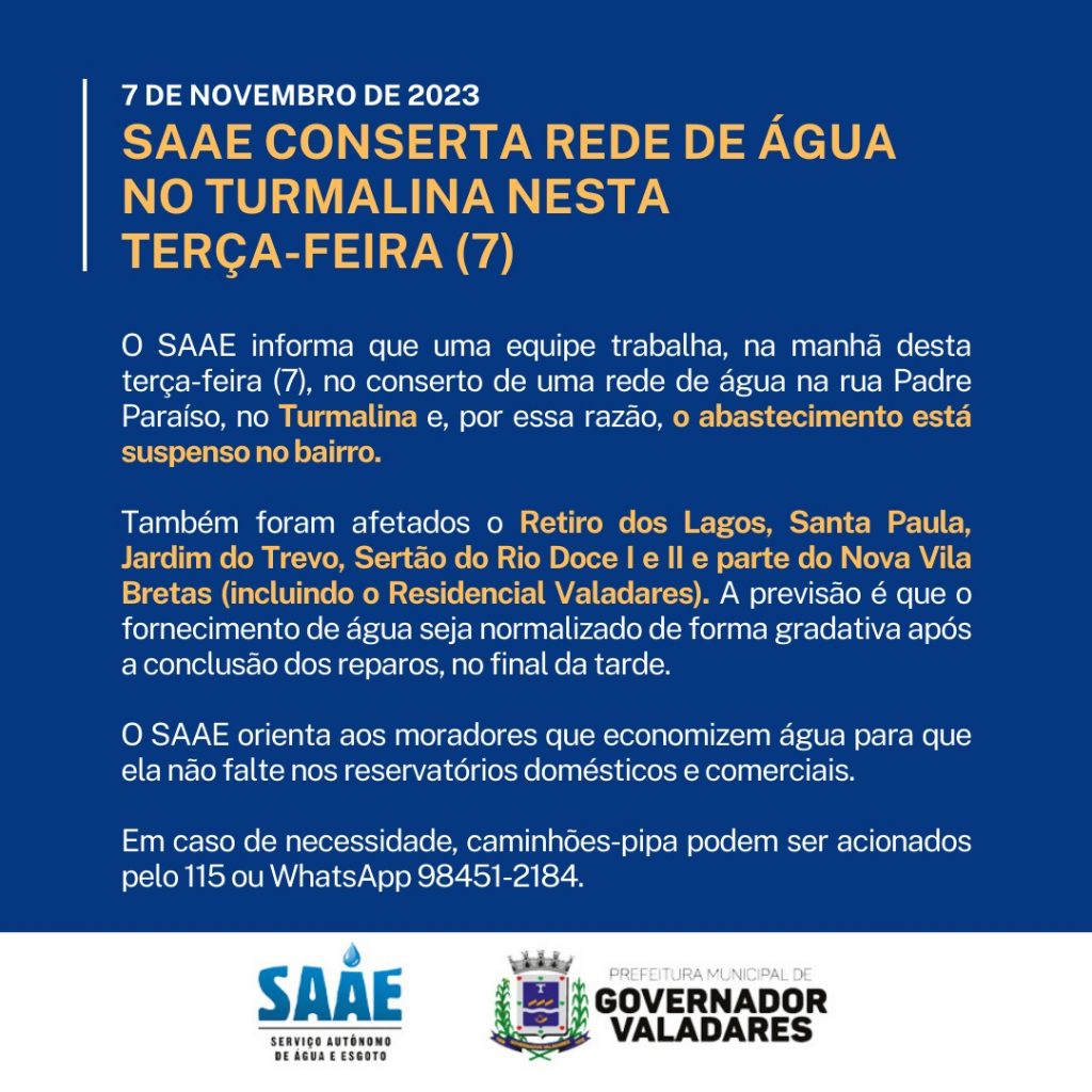 O SAAE orienta aos moradores desses bairros que economizem água para que ela não falte nos reservatórios domésticos e comerciais. Em caso de necessidade, a população pode acionar caminhões-pipa. O serviço atende pelo número 115 ou WhatsApp (33) 98451-2184.
