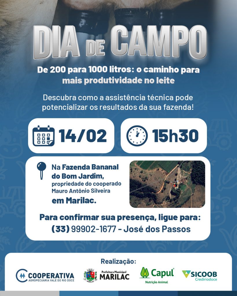 GOVERNADOR VALADARES – A Cooperativa Agropecuária Vale do Rio Doce realiza, na próxima sexta-feira (14), um Dia de Campo na Fazenda Bananal do Bom Jardim, em Marilac. O evento, que começa às 15h30, vai apresentar os resultados alcançados por meio da capacitação técnica e gerencial dos cooperados. O foco será o aumento da produção de leite e a aplicação de novas tecnologias no setor.